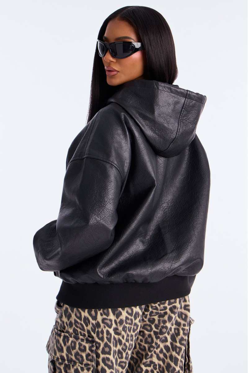 Стильна об'ємна куртка-бомбер з гладкої штучної шкіри. Модель оснащена капюшоном, зручною застібкою-блискавкою та функціональними кишенями. Довгі рукави та затяжки додають комфорту. Підкладка забезпечує тепло. Ідеально підходить для створення сучасних міських образів.