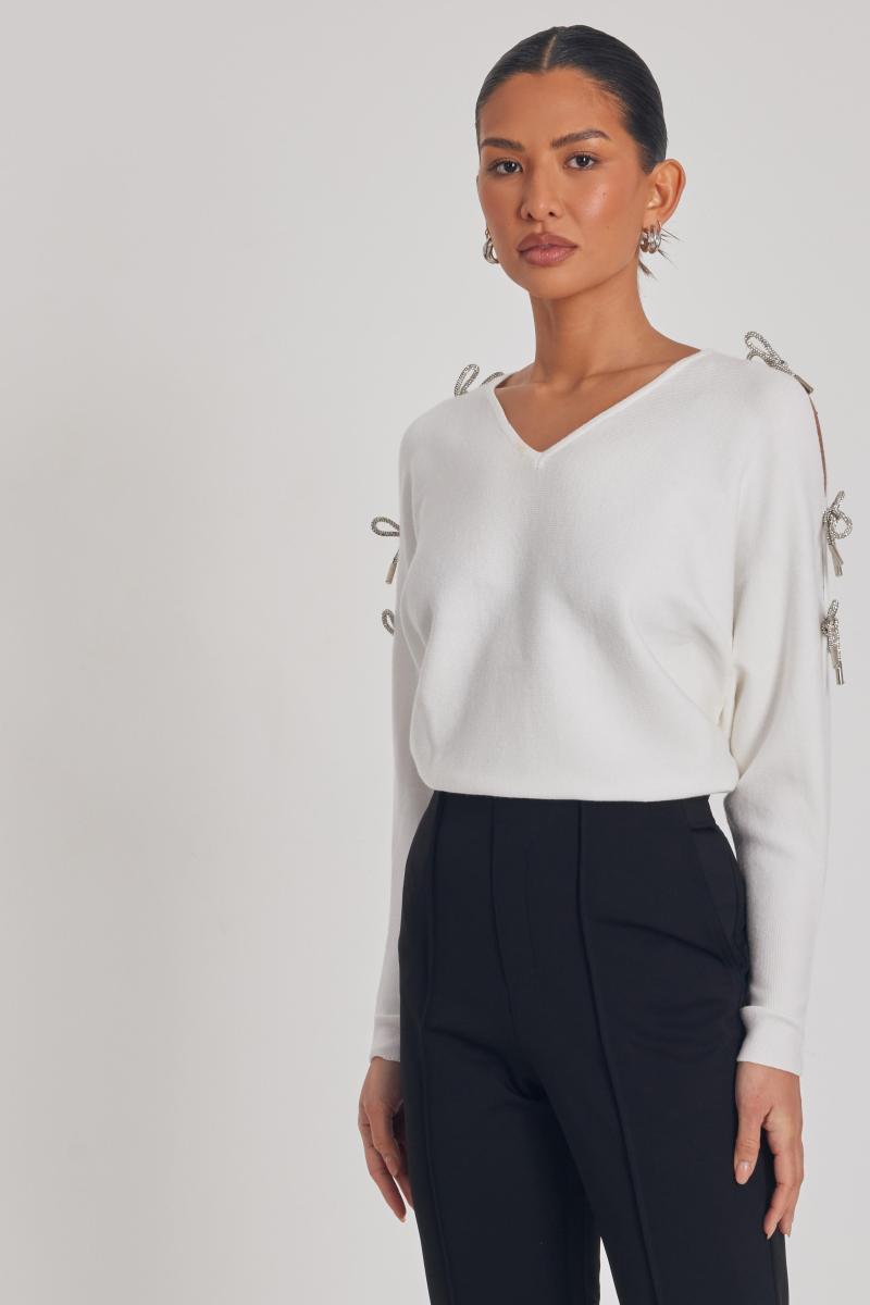 Цей джемпер Batwing оснащений трикотажним дизайном з деталями обробки лука діаманте та довгими рукавами. Ідеально підходить для повсякденних виїздів або ночей побачень, він пропонує комфортний пристосування та стильний вигляд.