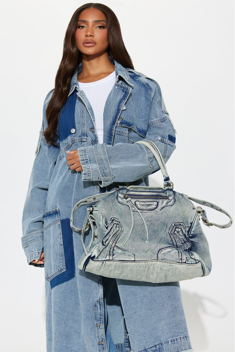 Стильна сумка-сатчел "Denim On Denim" вражає своєю оригінальністю. Вона має практичний знімний ремінь для носіння через плече, зовнішню кишеню для дрібниць та надійну застібку-блискавку. Унікальний дизайн досягається завдяки спеціальній обробці тканини, що робить кожну модель неповторною.